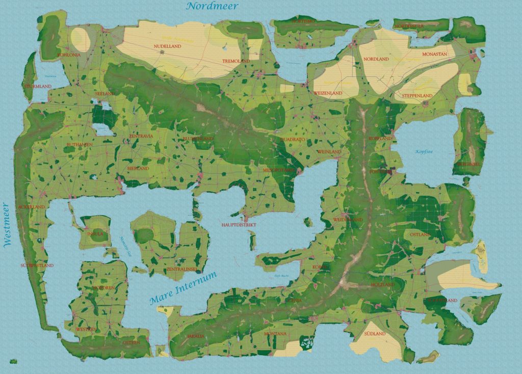 Landauri ist eine Inselwelt, die sich rund 650 km von Ost nach West und rund 450 km von Nord nach Süd ausdehnt. Eine Haupt-Landmasse kringelt sich um ein inneres Meer – das Mare Internum. Weitere Inseln – sowohl in diesem Binnenmeer als auch außerhalb – kommen hinzu. Es gibt Gebirge, Wüsten, Wälder und fruchtbare Ebenen. Es gibt Flüsse und Seen, die durch Kanäle miteinander verbunden sind. Es gibt Städte und Dörfer und einzelne weit abgelegene Siedlungen.