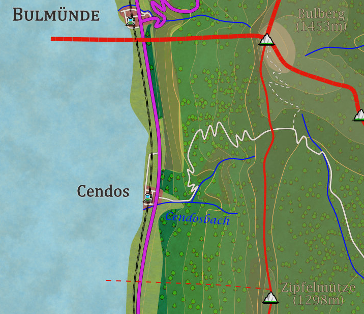 Cendos ist ein Dorf im Landkreis Andos, gelegen im Ackerland. Mit einer Bevölkerung von 791 Menschen und einer Höhe von 18 Metern über dem Meeresspiegel ist es die nördlichste Siedlung an der Westküste des Ackerlandes. Das Dorf ist umgeben vom dicht bewaldeten Westabhang des nördlichen Westmassivs, einer Landschaft, die aufgrund ihrer Dichte und ihres schwierigen Terrains nur schwer zugänglich ist. Die höchste Erhebung in der Nähe von Cendos ist der Bulberg mit einer Höhe von 1.453 Metern. Der Bulberg liegt am Dreiländereck zu den benachbarten Regionen Sturmland und Buthanien. Der Aufstieg zum Gipfel ist lediglich von Kleinnoliz aus möglich und gilt als anspruchsvoll.