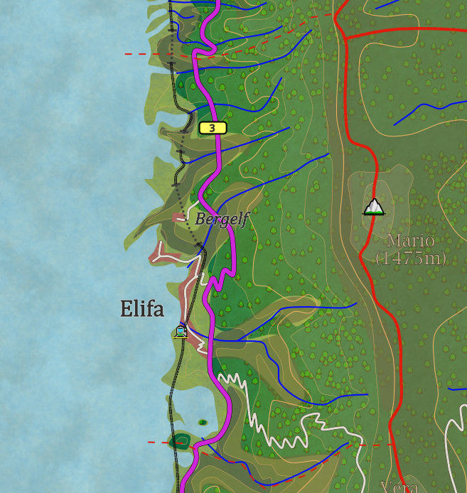 Elifa ist ein malerisches Küstendorf, das sich unterhalb des majestätischen Berges Mario erstreckt. Es ist bekannt für seine pittoreske Lage an der Küste und seine reizvolle Umgebung. Die Gemeinde besteht aus zwei Teilen – dem Teil entlang der Küstenstraße und dem alten Ortskern auf einer Halbinsel etwas nördlich davon. Zur Gemeinde gehört auch der kleine Flecken Bergelf, der auf einer kleinen Hochfläche über den Klippen liegt und eine atemberaubende Aussicht auf das Meer bietet.
