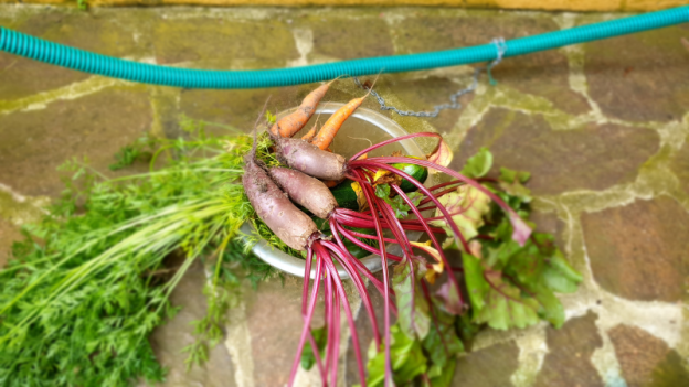 Unter den köstlichen Geschenken waren rote Beete, Möhren, eine Zucchini und Einleggurken. Diese Auswahl an frischem Gemüse lässt mein Herz höherschlagen, da ich bereits einige Gerichte im Kopf habe, die ich damit zaubern kann.