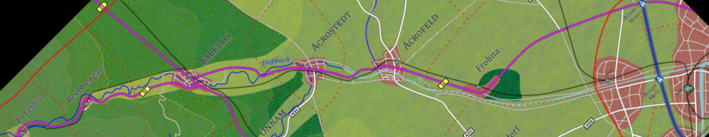 Die Reise beginnt am Ackero Hauptbahnhof, dem Verkehrsknotenpunkt des Ackerlandes. Von dort aus schlängelt sich die Strecke entlang des Flusses Acro in nordwestlicher Richtung. Nach Acrostedt ändert sich die Landschaft langsam, während der Zug entlang des malerischen Floßbachs weiterfährt. Die Umgebung wird bergiger und sobald Talflos erreicht ist, besteht die Möglichkeit zum Umsteigen in die ebenfalls beliebte Gebirgsrandbahn des Westmassivs, die Bahnstrecke 98 Ackero – Arisko.