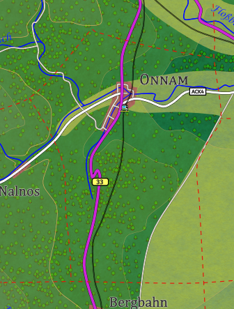 Ch.: B33 (N: Talflos 7km, S: Bergbahn 12km); Ack4 (W: Nalnos, O: Acrostedt)
