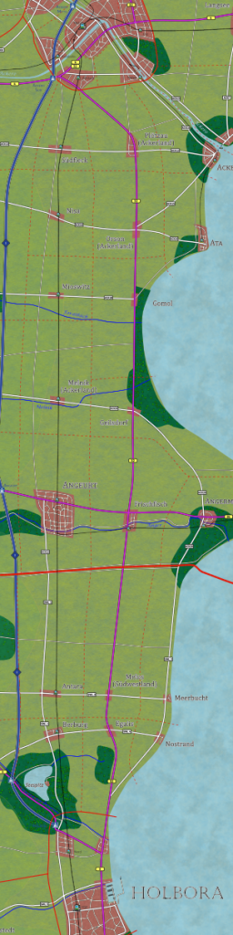 Angfurt (38,1km) ist eine malerische Kreisstadt in der südlichen Ackero-Ebene. Bekannt ist die Stadt für ihre reiche Geschichte und ihre lebendige kulinarische Szene. Die Angfurter Mühlenbäckerei „Goldene Kruste“ stellt köstliches Brot und Gebäck her, während die Käserei „Milchmeer“ hochwertige Käsesorten und Milchprodukte anbietet. Das Angfurter Heimatmuseum gibt Einblicke in die Geschichte der Region, während der alte Burgturm und Teile der Stadtmauer beeindruckende historische Sehenswürdigkeiten sind. Angfurt bietet auch verschiedene Unterkünfte und Einkehrmöglichkeiten für Besucher. In Angfurt können die Passagiere zu der Linie 103 der Ackerbahnen wechseln, die entlang des Mare Internum nach Spitzkap führt.