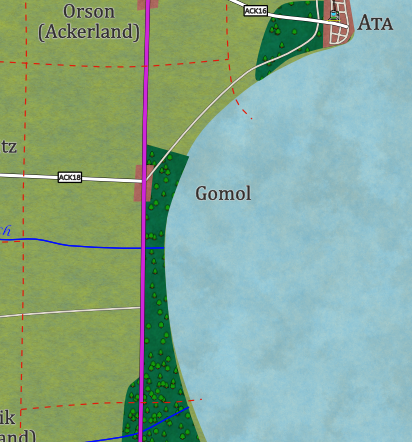 Ch.: B32 (N: Orson 6km, S: Geilsdorf 9km); Ack18 (W: Mioswitz); Küstenweg nach Ata; Feldweg nach Florenz