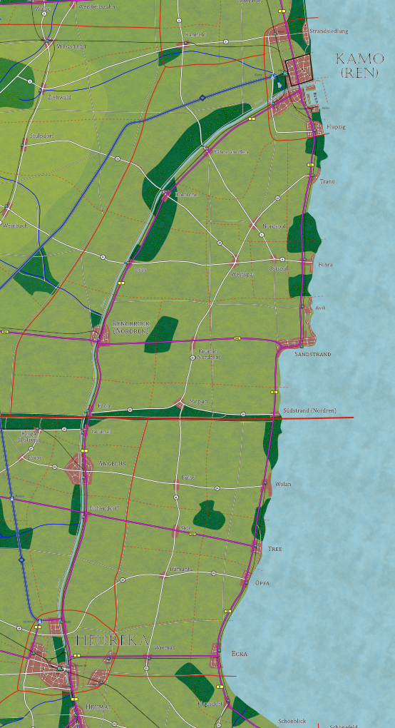 Kamo (155,4km), die Hauptstadt von Nordren. Kamo liegt an der Mündung des Flusses Reno in das Mare Internum. Die Stadt ist bekannt für ihre malerische Lage am Wasser und ihre vielen Parks und Grünanlagen. Hier befinden sich auch zahlreiche Kultur- und Bildungseinrichtungen, wie zum Beispiel die Universität von Kamo.