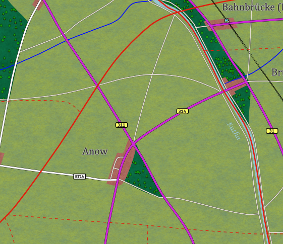 Ch.: B311 (SO: Nospunkt 13km, NW: Polla 10km); B314 (SW: Vorteil 11km, NO: Brücko 6km); BT14 (W: Gemsow)