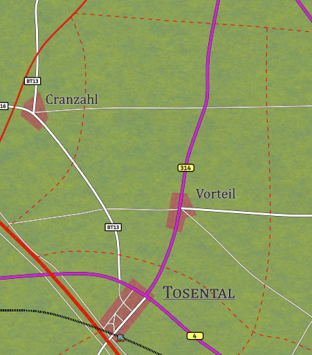 Ch.: B314 (S: Tosental 3,5km, N: Anow 11km); BT18 (O: Nospunkt); Feldweg nach Vergessen, Cranzahl
