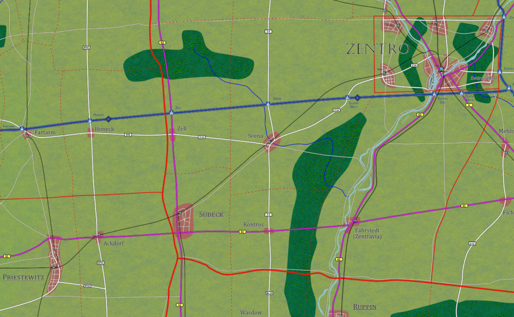 Die Line 93 der Buthabahn verbindet Rehstadt in Buthanien mit Zentro, der Hauptstadt von Zentravia. Von Rehstadt aus geht es nach Osten über den Buthanischen Landrücken nach Priestewitz. Von dort weiter nach Osten verlässt sie Buthanien und führt hinab in das Tal des Zento nach Zentro.