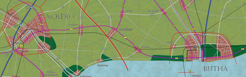 1001 Von Ackero nach Butha: Die Bahnlinie verbindet die ackerländische Hauptstadt Ackero mit Butha, der Küstenmetropole von Buthanien. Die 37,6 km lange Strecke führt durch abwechslungsreiche Landschaften, Dörfer und Städte und ist sowohl landschaftlich reizvoll als auch kulturell vielfältig. Sie bedient die Stationen Ackero, Langsee, Tosental, Tümplo und Butha. Ackero, am Zusammenfluss von Eros und Acro gelegen, ist ein historisch bedeutender Handelsplatz. Langsee, bekannt für Sauergurken und familiäre Gastfreundschaft, verkörpert ländliche Idylle. Tosental beeindruckt mit gotischer Kirche, regionaler Küche und einem lebendigen Stadtbild. Tümplo ist ein charmantes Dorf mit florierender Dorfgemeinschaft und traditionsreicher Kneipe. Endpunkt ist Butha, das mit maritimem Flair, Altstadtcharme und kultureller Vielfalt als bedeutendes Zentrum des Südens gilt. Die Linie bietet Regional-, Eil- und Expresszüge und verbindet urbanes Leben mit regionaler Identität.