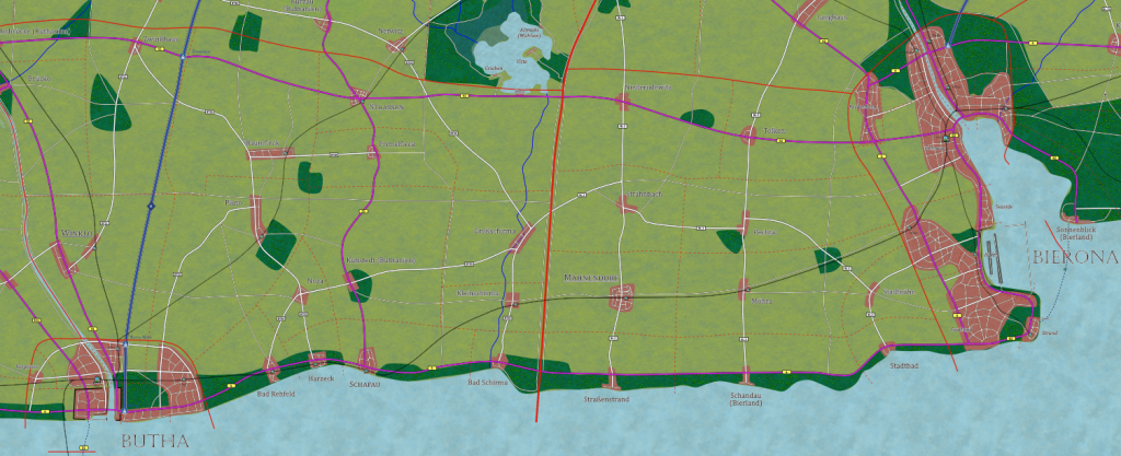 1002 Von Butha nach Bierona: Die Bahnstrecke verbindet auf 72 Kilometern die Hauptstadt Butha in Buthanien mit der Bierländer Metropole Bierona. Sie führt durch eine facettenreiche Region entlang der Küste des Mare Internum. In Butha, bekannt für Handel, Architektur und Handwerk, beginnt die Reise. Stationen wie das Künstlerdorf Bad Rehfeld, das Fischerdorf Harzeck und das waldreiche Schafau mit Stränden und Manufakturen zeigen die landschaftliche und kulturelle Vielfalt. Weiter östlich liegt das landwirtschaftlich geprägte Kleinschirma, gefolgt von Mähnendorf, einem urbanen Brau-, Bildungs- und Verwaltungszentrum. Möhra, als Brauerdorf mit dem berühmten „Dunklen Halm“, vereint Tradition und Regionalität. Ziel ist Bierona, eine pulsierende Großstadt mit Altstadt, Industrie, Hafen und kultureller Vielfalt.