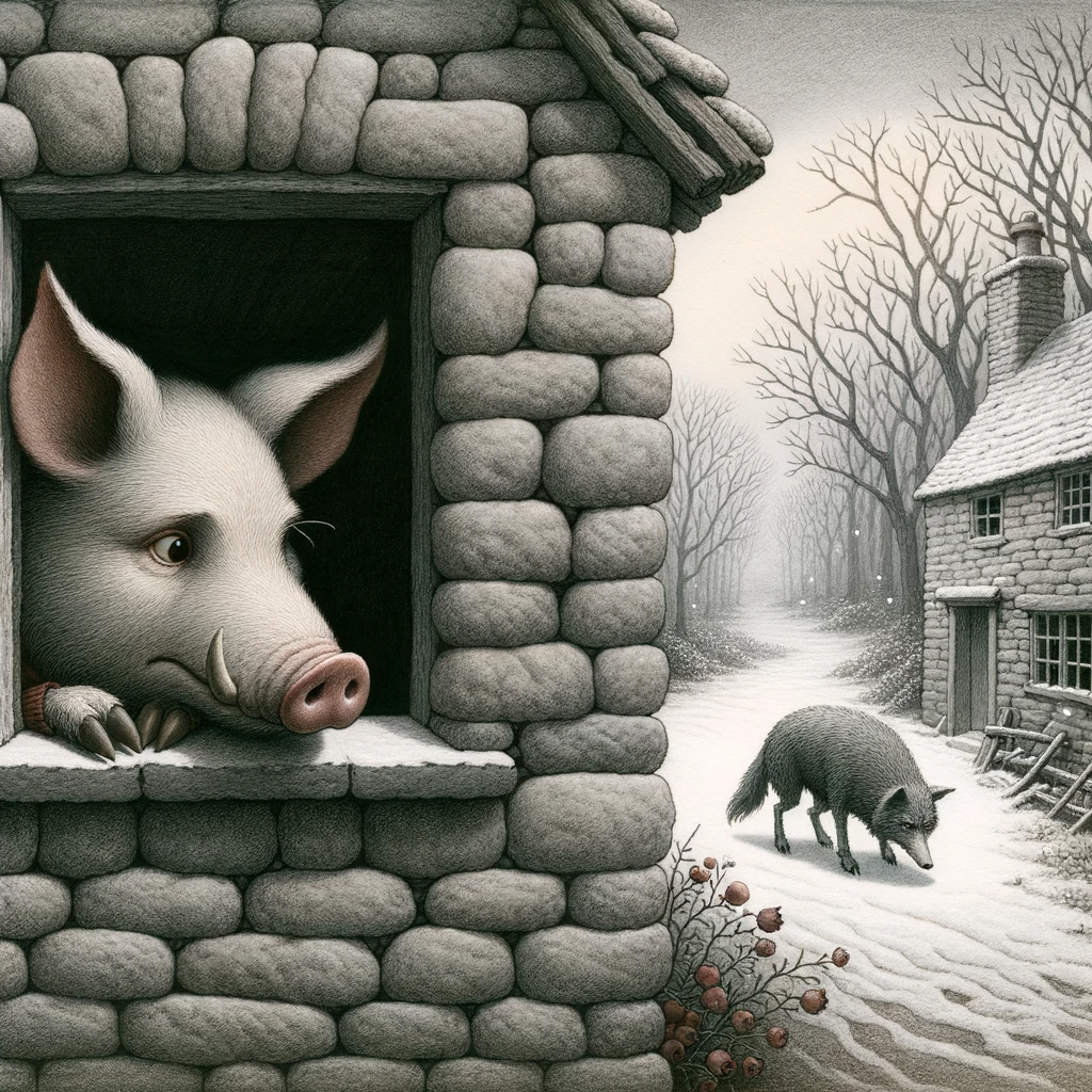 Der kleine Wolf war enttäuscht, aber er gab die Hoffnung nicht auf. Er ging zum Steinhaus des dritten Schweinchens und klopfte sanft an die Tür. „Hallo, kleines Schweinchen. Ich möchte nur spielen und dein Freund sein“, sagte er mit sanfter Stimme. Aber auch dieses Schweinchen versteckte sich in seinem Haus.