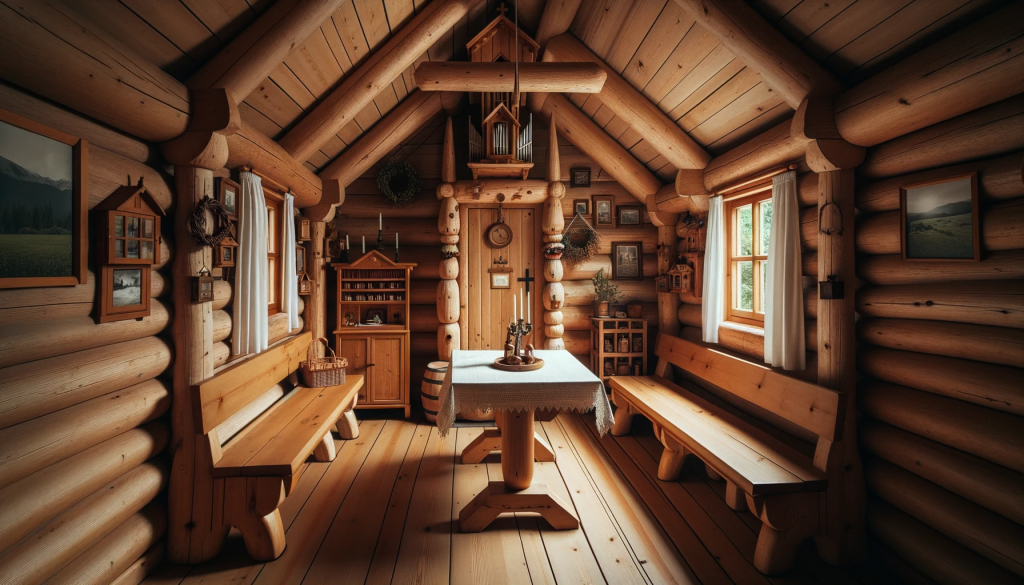 Der Innenraum der Dorfkapelle in Skola bietet eine einzigartige Atmosphäre, die von Wärme und Gemeinschaft geprägt ist. Im Unterschied zu traditionellen Kirchen, in denen Bänke und Stühle in Richtung eines zentralen Altars ausgerichtet sind, präsentiert sich die Kapelle von Skola in einer ungewöhnlichen Anordnung. Das erste, was Besucher bemerken, ist die zentrale Positionierung des Altars. Er steht inmitten des Raumes, so dass sich die Gemeindemitglieder ringsherum versammeln können. Dieses Layout fördert das Gefühl der Gemeinschaft und Einheit, da alle Anwesenden gleichsam im Zentrum des Gottesdienstes stehen. Es gibt keinen „vorderen“ oder „hinteren“ Bereich; jeder hat von seinem Platz aus einen gleich guten Blick auf den Altar. Die Bänke sind um den Altar herum angeordnet, was das gemeinschaftliche Erlebnis des Gottesdienstes verstärkt. Es entsteht eine Atmosphäre des Miteinanders, in der jeder Einzelne sowohl Geber als auch Empfänger von Gottes Wort ist.