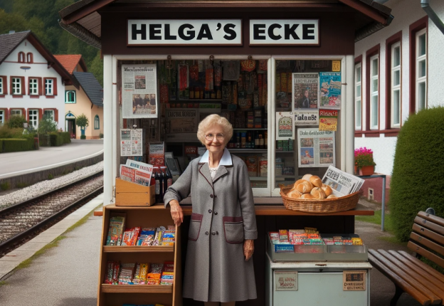 1975, im Alter von 26 Jahren, eröffnete Helga ihren eigenen Kiosk direkt neben der Bahnstation von Mühle. Der Kiosk, liebevoll „Helga’s Ecke“ genannt, wurde schnell zu einem beliebten Treffpunkt für Einheimische und Reisende. Hier bietet sie nicht nur Zeitungen, Süßigkeiten und Getränke an, sondern auch frische Brötchen und Backwaren aus der ehemaligen Familienbäckerei.
