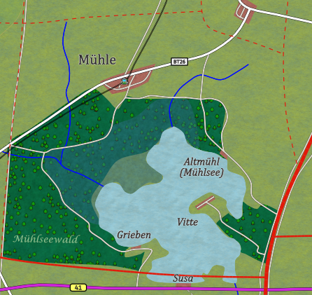 Ch.: BT26 (SW: Netwitz, NO: Folksi); Waldwege zum Mühlsee nach Altmühl, Grieben, Vitte; Feldweg nach Meinhaus