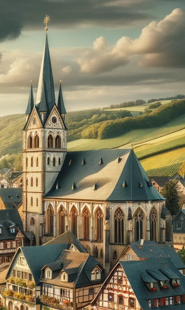 Architektonisch präsentiert sich die Kirche im gotischen Stil, mit hohen Spitzbögen, filigranen Fensterrosen und einem markanten Kirchturm, der weithin sichtbar ist. Die Fassade aus sorgfältig bearbeitetem Sandstein verleiht dem Gebäude eine majestätische Anmutung und zeugt von der handwerklichen Kunst der Erbauer.