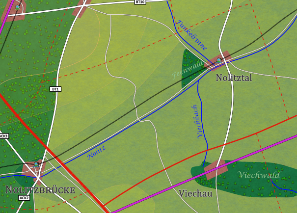 Ch.: BT3 (S: Viechau, N: Taberna); Nolitz-Uferweg (W: Nolitzbrücke, O: Verno); Feldwege nach Beduina, Malitz, Altai