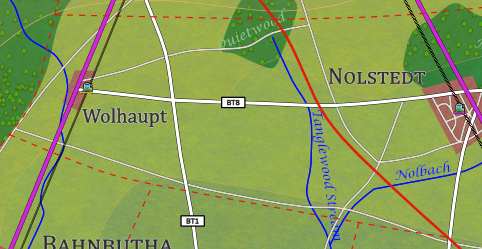 Ch.: B33 (SW: Bahnbutha 5,5km, NO: Gasthaus 4km); BT8 (O: Nolstedt), BT1 (S: Schleußingen); Feldwege nach Passtal an der Butha, Buthawasser