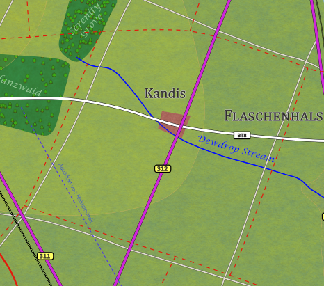 Kandis, ein malerisches Dorf mit nur 125 Einwohnern, liegt idyllisch im Vorland des Sturmgebirges. Umgeben von sanften Hügeln und fruchtbaren Ackerflächen, schmiegt sich das Dorf an den Ufer des Dewdrop Stream, einem kleinen, plätschernden Bach, der seine Reise im nahegelegenen Serenity Grove beginnt und südlich der Stadt Flaschenhals in die Wetha mündet.
