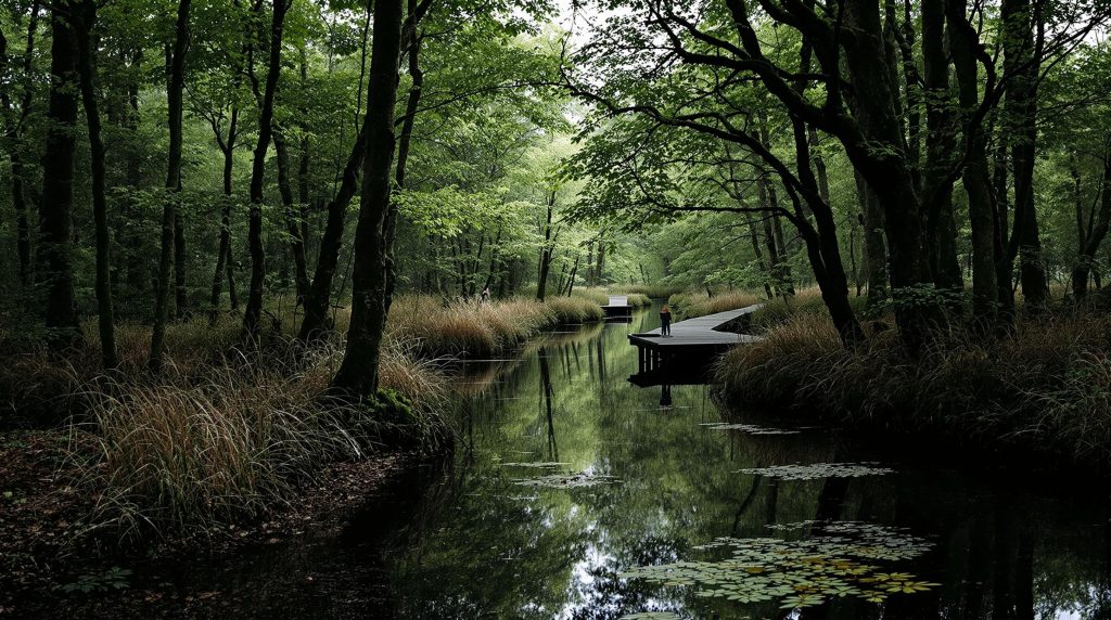 Schittinger Auenpfad Schittingen Hp. (31,8km), mit 524 Einwohnern auf 122 m NN, liegt im dichten Schittinger Auenwald am Zajinbach im Südwesten des Kreises Unterstrand. Der Ort ruht auf einer leichten Anhöhe über feuchten Wiesen und Wasserarmen, verbunden durch Bretterstege und kleine Brücken. Herzstück des Dorfes ist die Auenwolle Schittingen eG, eine Genossenschaft, die seit 1923 Wolle von Schafherden aus den Auen und Sandrücken des Seelandwaldes wäscht, sortiert und kardiert. Der Dampf aus den Blechwannen und der Geruch von Lanolin prägen das Dorfbild. Die Wolle gelangt weiter nach Papierstedt zum Werk „Vier Mühlen – Tuch & Strick“, während der Mist der Herden die Roggenfelder des Agrarverbunds Seeland-Ebene Unterstrand düngt. Ein handgewebtes Tuch aus Schittinger Wolle liegt im Altarraum der Maria-Magdalena-Kirche in Zajin. Der Auenpfad, ein 4,2 Kilometer langer Rundweg, führt Besucher durch Erlenwälder, über Stege und an einer alten Reusenhütte vorbei. Schittingen bewahrt ein stilles Gleichgewicht von Wasser, Arbeit und Gemeinschaft – ein Dorf, das durch den Rhythmus seiner Genossenschaft, den Klang des Bachs und die Beständigkeit seiner Menschen lebt.