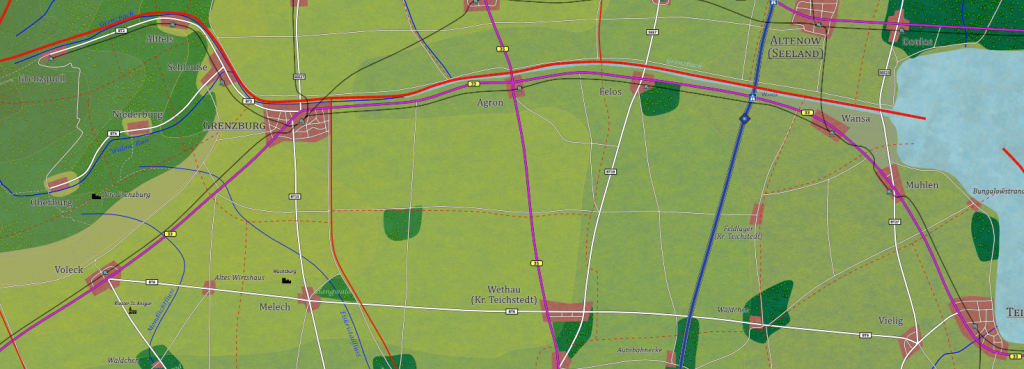 Von Seestadt aus, der Hauptstadt des heutigen Seelandes nach westen verläuft die Linie 88 der Seelandbahn am Ufer des Kleinen Teiches, dann weiter nach Süden bis über den Grenzbach in den Norden Buthaniens nach Teichstedt am Südufer des Grenzsees.