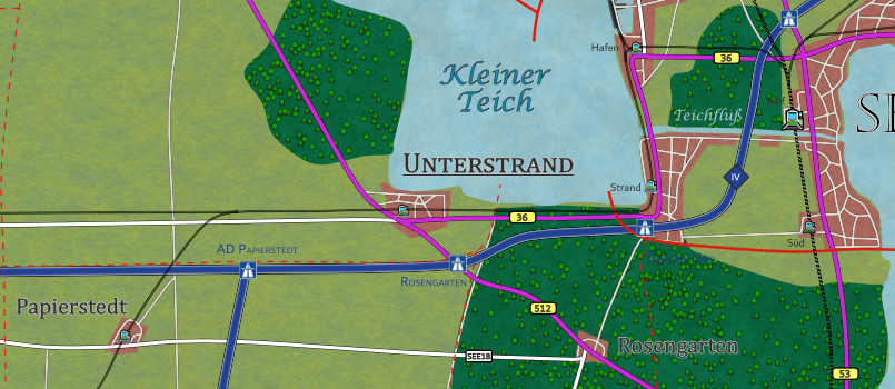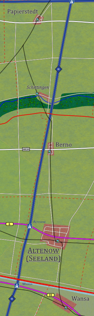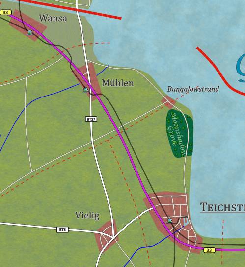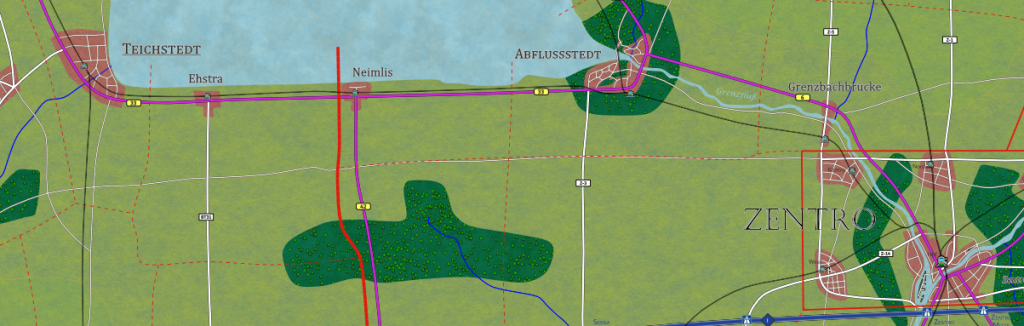 Von Seestadt aus, der Hauptstadt des heutigen Seelandes nach westen verläuft die Linie 87 der Seelandbahn am Ufer des Kleinen Teiches, dann weiter nach Südwesten in Richtung Sturmgebirge nach Grenzburg (heute in Buthanien).