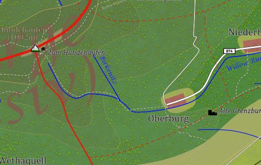 Ch.: BT4 (O: Niederburg); Waldstraße nach Grenzquell; Wanderwege zur Baude Zum Hundehaufen, zur Alten Grenzburg