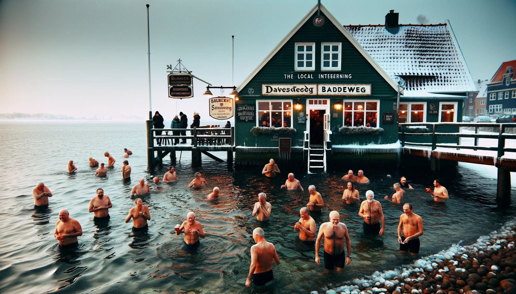 Im Winter verwandelt sich der Pub in einen gemütlichen Zufluchtsort. Für die mutigen Gäste, die sich auch in der kalten Jahreszeit ins Meer wagen, gibt es ein besonderes Angebot: kostenlosen Glühwein und Grog, um sich nach dem Bad im eiskalten Wasser wieder aufzuwärmen.