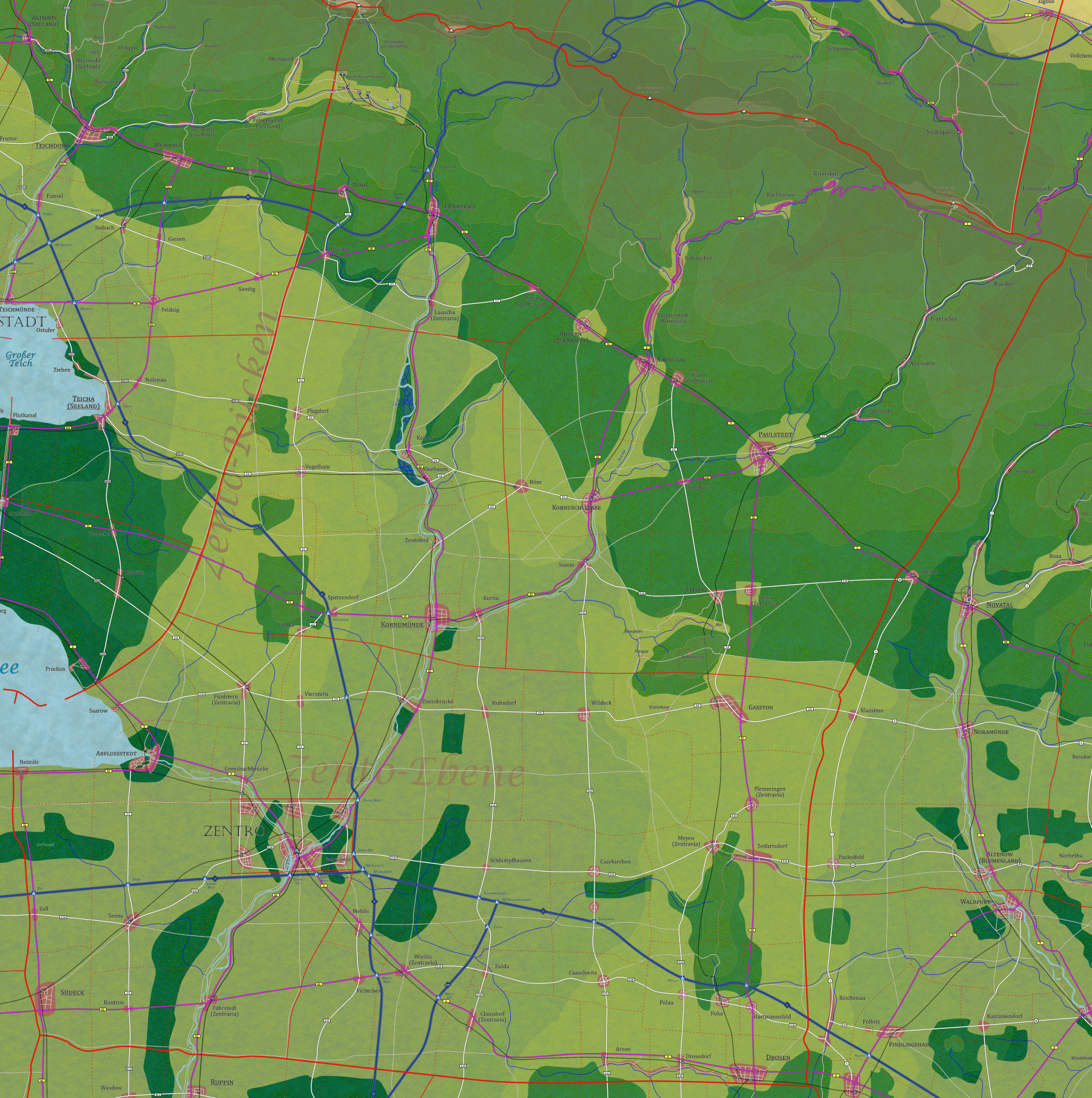 Der Landkreis Südeck (Pop.: 13.896) ist ein ländlich-geprägter Landkreis im Süden und Südwesten Zentravias. Er erstreckt sich über die breite Zento-Ebene und grenzt im Westen an Buthanien, im Süden an das Bierland sowie im Nordwesten an den Grenzsee. Die Nähe zur Hauptstadt Zentro prägt den Alltag der knapp 13.900 Einwohner: Viele pendeln täglich dorthin für Amtsgänge, Einkäufe oder Arbeit, während im Landkreis selbst lokale Netzwerke aus Nachbarschaft, Vereinen, Handwerk und kleinen Handelsrouten das soziale und wirtschaftliche Leben tragen. Im Zentrum des Kreises liegt die Kreisstadt Südeck (2.558 Einwohner), ein funktional strukturierter Ort, in dem sich Verwaltung, Marktplatz und praktische Infrastruktur wie Bauhof, Maschinenring und Ersatzteilladen bündeln. Die Stadtkirche dient als Orientierungspunkt, und die umgebaute Kreisscheune beherbergt Entwässerungsgeräte und VHS-Kurse – Zeichen eines Alltags, der stark von praktischem Arbeiten und regionaler Kooperation geprägt ist. Entlang der großen Verkehrsachsen (A1/A5 und mehrere Bundesstraßen) verteilen sich Dörfer und Kleinstädte wie Zell, Seena und Kontros, deren Alltag von Landwirtschaft, Pendelverkehr und lokalem Handwerk bestimmt wird. Im Nordwesten, am Grenzsee, verschiebt sich das Leben hin zu Wasserwirtschaft, Freizeit und Tourismus mit Orten wie Abflußstedt, Neimlis und dem ruhigen Saarow. Hier verbinden sich handwerkliche Betriebe, Gastfreundschaft und Seenähe zu einem eigenständigen regionalen Charakter.