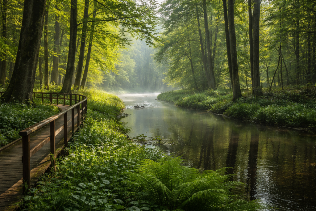 Der Landkreis Ferkelau (Pop.: 11.758) liegt im nordwestlichen Teil Zentravias, eingebettet in die Täler des oberen Zento und seiner Nebenflüsse. Das etwa 30 mal 40 Kilometer große Gebiet wird im Norden vom Kamm des Zentralmassivs begrenzt, das zugleich die Grenze zum Nudelland bildet. Die Landschaft ist geprägt von tiefen Flusstälern, Bergkämmen und verstreuten Siedlungen. Die Kreisstadt Ferkelau liegt am Punkt, an dem der Zento schiffbar wird, und bietet eine Mischung aus traditioneller Holzarchitektur und modernen Verwaltungsbauten mit Altstadt, Marktplatz und Uferpromenade. Der Kreis umfasst verschiedene Ortschaften: das Bergdorf Ferkeltal, das ruhige Patz, das Flussdorf Lauscha, das versteckte Horchau, das wirtschaftliche Zentrum Zunig sowie das für Instrumentenbau bekannte Petra. Eine Besonderheit ist die seit 1952 abgeriegelte „Queck Research Area“, ein geheimnisumwittertes Forschungsareal. Der Queckberg (1347 m) markiert das Dreiländereck zwischen Zentravia, Seeland und Nudelland. Der Landkreis ist über die Autobahn A4, mehrere Bundesstraßen sowie die Zentralmassivbahn gut erschlossen. Wanderwege, regionale Gastronomie, Handwerksbetriebe (Möbelmanufaktur, Instrumentenbau, Brauerei) und Wellnessangebote machen Ferkelau zu einem beliebten Ziel für Naturreisende, die Ruhe und Authentizität suchen.