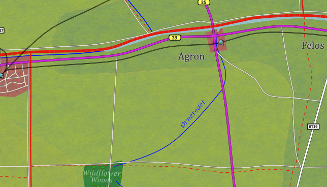Ch.: B33 (W: Grenzburg 11km, O: Felos 7km); B35 (S: Wethau 12km, N: Kleinros 5km); Feldweg nach Feldlager, Mühlen, Autobahnecke