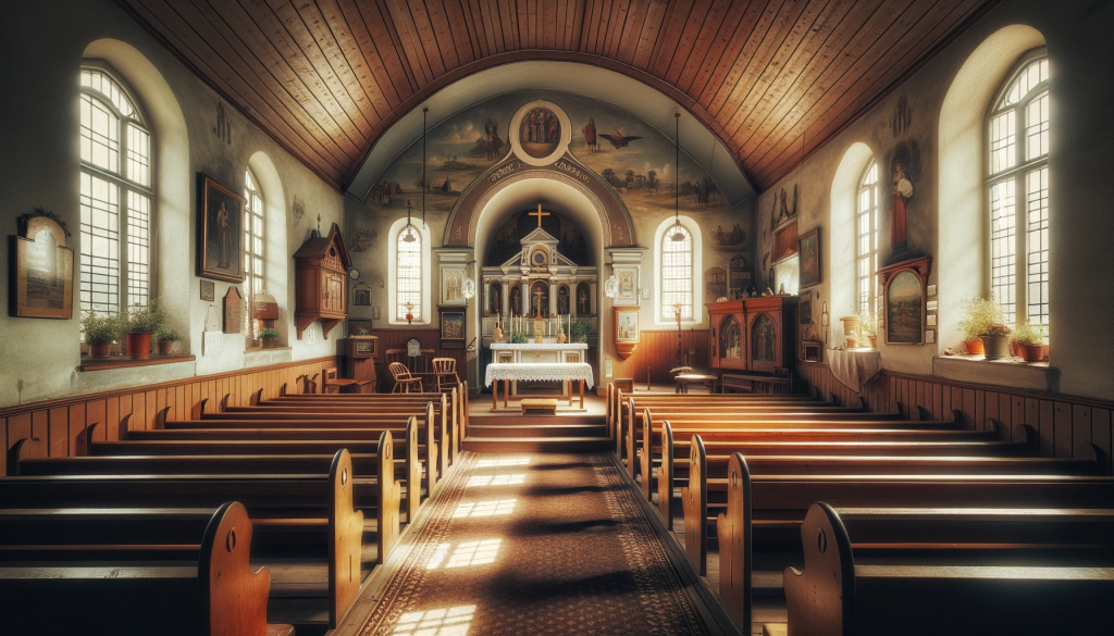 Das Innere der Kirche ist geprägt von einer Atmosphäre der Stille und Andacht. Die Bänke, aus robustem Eichenholz gefertigt, reihen sich ordentlich auf und blicken auf den schlichten, aber eindrucksvollen Altar. Ein besonderes Highlight sind die Glasfenster, die klar und rein das Licht der Sonne in den Raum hineinlassen.