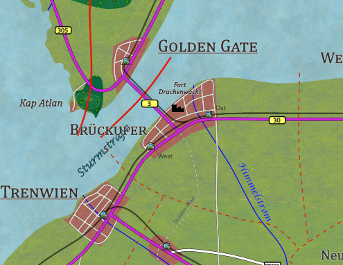 Die Stadt Brückufer, gelegen im Landkreis Westerner Umland des Sturmlands, stellt mit ihrer Einwohnerzahl von 12.457 Menschen und einer Höhe von 21 Metern über dem Meeresspiegel ein bemerkenswertes urbanes Zentrum dar. Ihre besondere Lage an der Küste der Sturmstraße, einer Meeresstraße, die das Westmeer mit der Sturmsee verbindet und das Festland Landauris von der Sturminsel trennt, verleiht Brückufer eine strategische und kulturelle Bedeutung, die weit über ihre Größe hinausgeht. Nur 2,5 Kilometer trennen die Stadt vom Südzipfel der Sturminsel, zu der die berühmte Golden Gate Brücke führt und die den Namen der Stadt Golden Gate auf der Insel prägt.