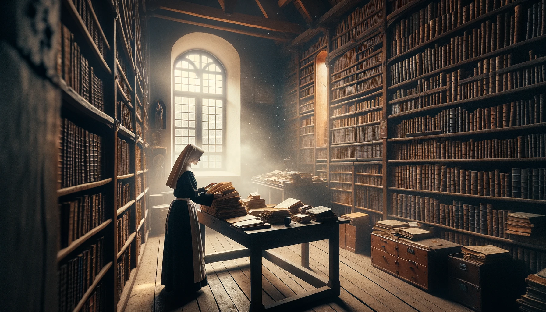 Schwester Maria in der Bibliothek