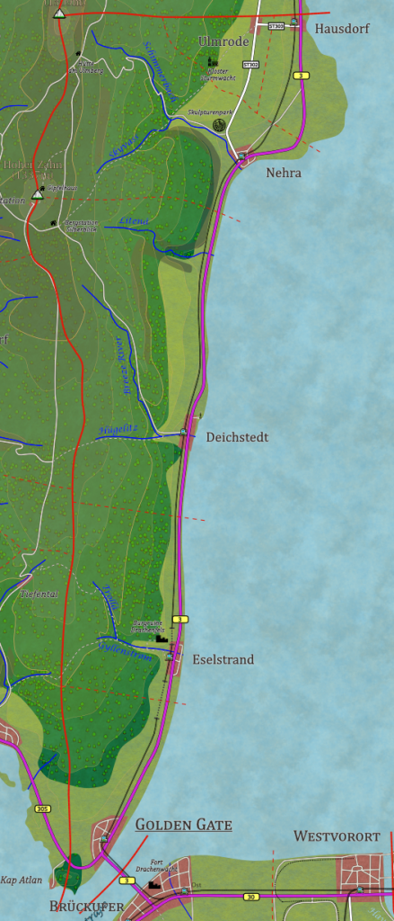 Entlang der Küste liegen mehrere Dörfer, die sich durch ihre unmittelbare Nähe zum Sturmmeer auszeichnen. Eselsstrand mit seinen knapp 1.250 Einwohnern ist bekannt für seine fruchtbaren Böden durch den Gyllenstrøm. Der Name stammt von einer Legende über einen Fischer, der von Eseln gerettet wurde. Deichstedt, etwas weiter nördlich gelegen, zieht mit seinen traditionellen Fischrestaurants Besucher an, die authentische Sturmländische Küche erleben möchten. Nehra, mit über 2.500 Einwohnern, ist bekannt für seinen lebhaften Wochenmarkt, während das beschauliche Hausdorf eher durch seine ruhige, abgeschiedene Lage besticht. In Ulmrode, etwas abseits im Landesinneren gelegen, können Besucher die ländliche Ruhe genießen und sich an den handgefertigten Produkten aus den lokalen Manufakturen erfreuen.