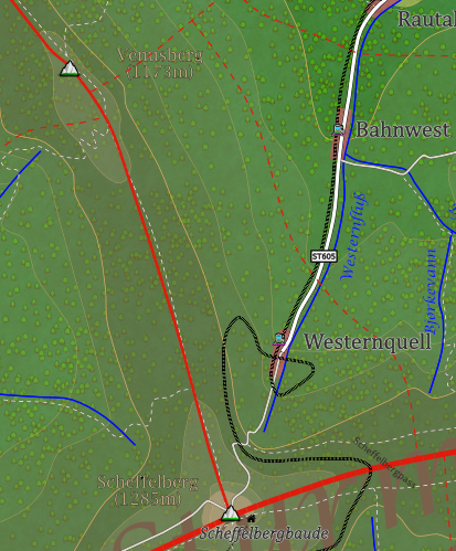 Ch.: ST605 (N: Bahnwest); Gebirgsstraße zur Scheffelbergbaude in Buthanien, abgehende Wanderweg zum Venusberg und zum Panoramapark Sturmgebirge