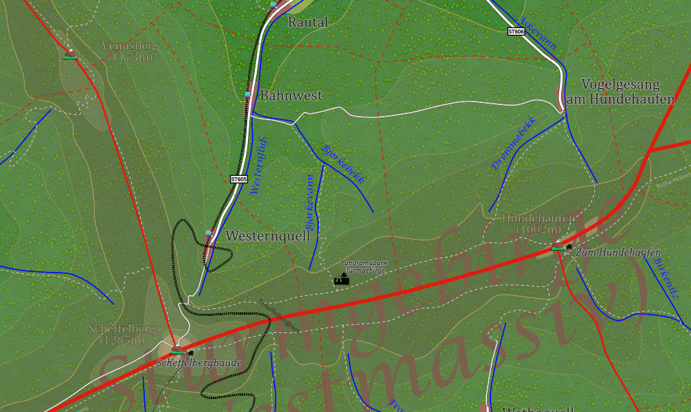Ch.: ST605 (N: Bahnwest); Gebirgsstraße zur Scheffelbergbaude in Buthanien, abgehende Wanderweg zum Venusberg und zum Panoramapark Sturmgebirge