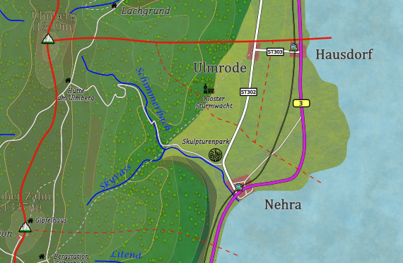 Ch.: B3 (S: Deichstedt 12km, N: Hausdorf 8km); ST302 N: Skulpturenpark, Ulmrode; Schimmerbachstraße zur Hütte am Ulmberg, Wanderwege zum Kloster Sturmwacht und zur Bergstation Silberblick
