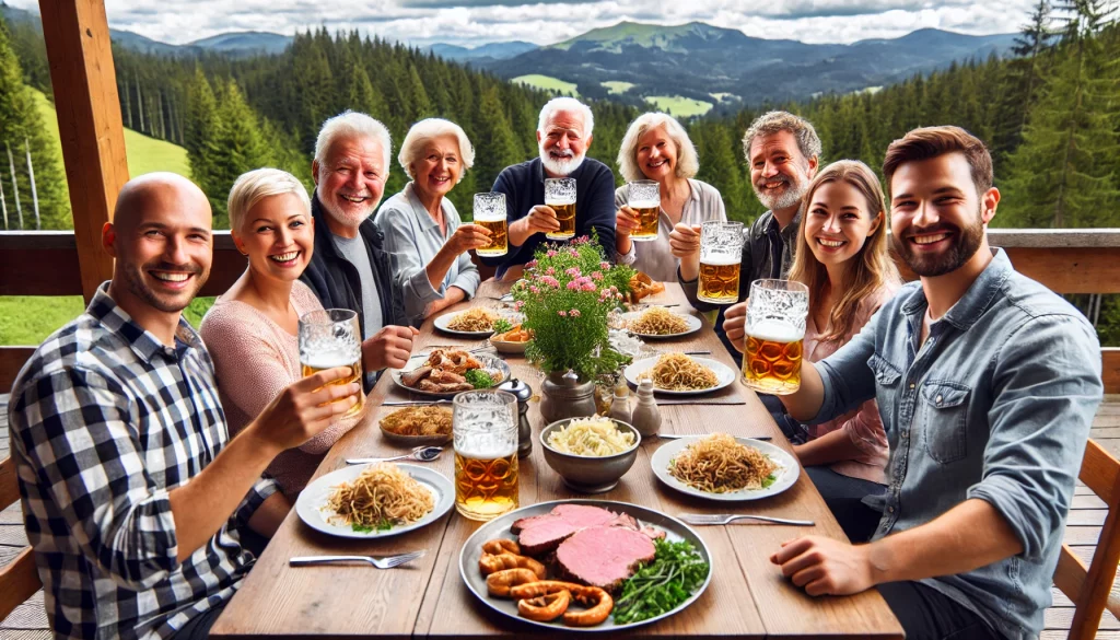 Die Speisekarte des Gipfelhauses bietet eine Vielzahl von traditionellen Gerichten und Getränken. Besonders beliebt sind der köstliche Käsekuchen mit Waldbeeren und der herzhafte Schweinebraten mit Knödeln und Sauerkraut. Darüber hinaus gibt es eine Auswahl an warmen Suppen, deftigen Eintöpfen und frischen Salaten. Die Getränkekarte umfasst lokale Biere, Weine und hausgemachte Limonaden, die perfekt zu den angebotenen Speisen passen.