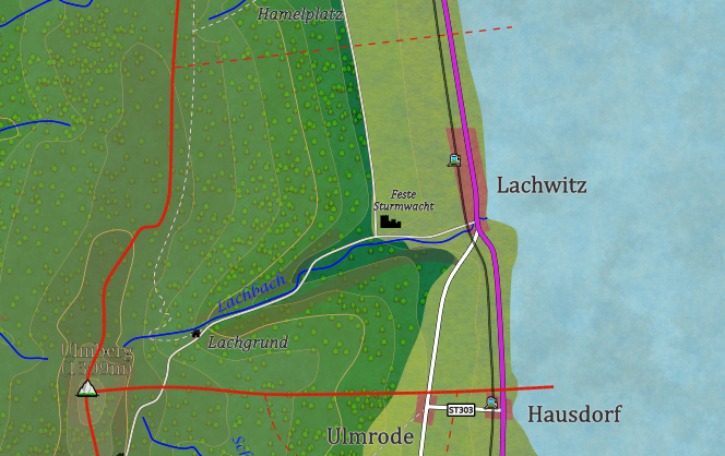 Lachwitz, das südlichste Dorf des Landkreises Sturminsel Nordost im Land Sturmland, liegt an der malerischen Mündung des Lachbaches ins Sturmmeer. Direkt hinter der Küste erhebt sich das Land sanft hinauf zum Sturminselgebirge, dessen Ausläufer das Dorf umgeben.