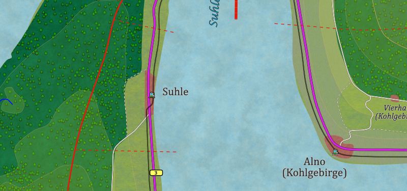 Suhle liegt an der Ostküste der Sturminsel, direkt an der Suhler Meerenge, die in das offene Sturmmeer übergeht. Vom breiten, sandigen Strand aus kann man bei klarem Wetter die acht Kilometer entfernte Küste von Kohlonia erkennen, auch wenn der Himmel oft von tiefhängenden Wolken und der Wind von salziger Gischt geprägt ist. Die Küste ist geprägt von hohen Dünen und dunklen Felsformationen, die von der rauen Brandung geformt wurden. In den Sommermonaten wagen sich einige Schwimmer in das kühle Wasser, doch die Strömung kann tückisch sein.