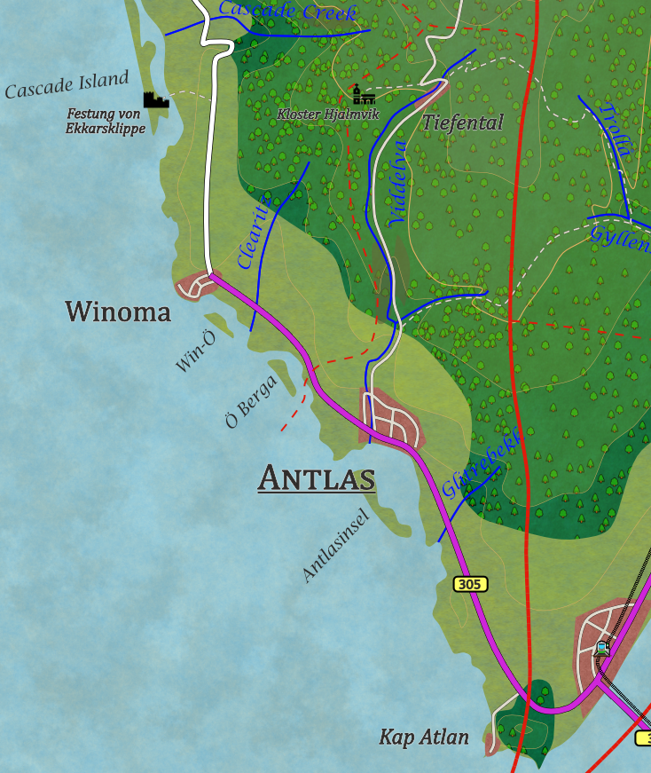 Antlas, die Kreisstadt des Landkreises Sturminsel West liegt an der rauen Westküste der Sturminsel, wo der Viddelva ins Westmeer mündet. Die Stadt schmiegt sich an die felsigen Klippen, die das Ufer säumen, und steigt von der Hafenkante bis zum Tiefentaler Tor in der alten Stadtmauer auf 150 Meter über dem Meeresspiegel an. Vor der Küste liegt die langgezogene, unbewohnte Antlasinsel, die sich über zwei Kilometer erstreckt und an ihrer schmalsten Stelle kaum fünfzig Meter misst. Ganz verlassen ist sie jedoch nicht, denn dort weidet das ganze Jahr über eine Schafherde, gehütet von der Stadtschäferin Maja Nyström und ihrem treuen Schäferhund Fritzi. In den frühen Morgenstunden sieht man Maja oft mit ihrem Boot zum Eiland übersetzen, während Möwen in der salzigen Brise kreisen.