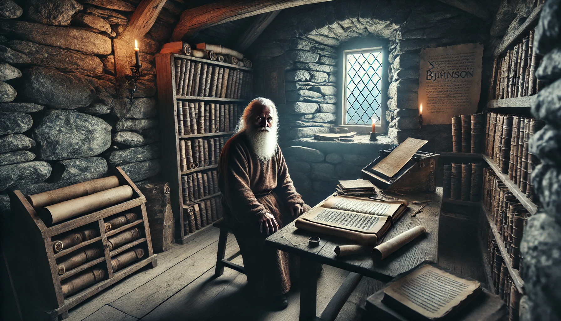 Neben der Kirche befinden sich die Überreste der einstigen Wohngebäude der Mönche. Die Zellen, in denen sie lebten, sind heute weitgehend verfallen, ihre Mauern von Moos und Flechten überzogen. Nur wenige Fundamente ragen noch aus dem Boden, doch in einigen der Ruinen kann man erkennen, wo einst kleine Feuerstellen oder Lagerstätten waren. Ein alter Brunnen, der tief in das Felsgestein gehauen wurde, liefert bis heute klares Quellwasser und ist eine der wenigen noch genutzten Einrichtungen des ehemaligen Klosters. In einem der weniger zerstörten Räume lebt Sverre Bjørnson, ein zurückgezogen lebender Gelehrter, der sich der Erforschung alter Schriften widmet. Er verbringt seine Tage mit der Restaurierung vergilbter Pergamente, die in den alten Archiven des Klosters gefunden wurden, und nimmt gelegentlich Pilger oder Forscher in Empfang, die mehr über die Geschichte von Hjalmvik erfahren möchten.