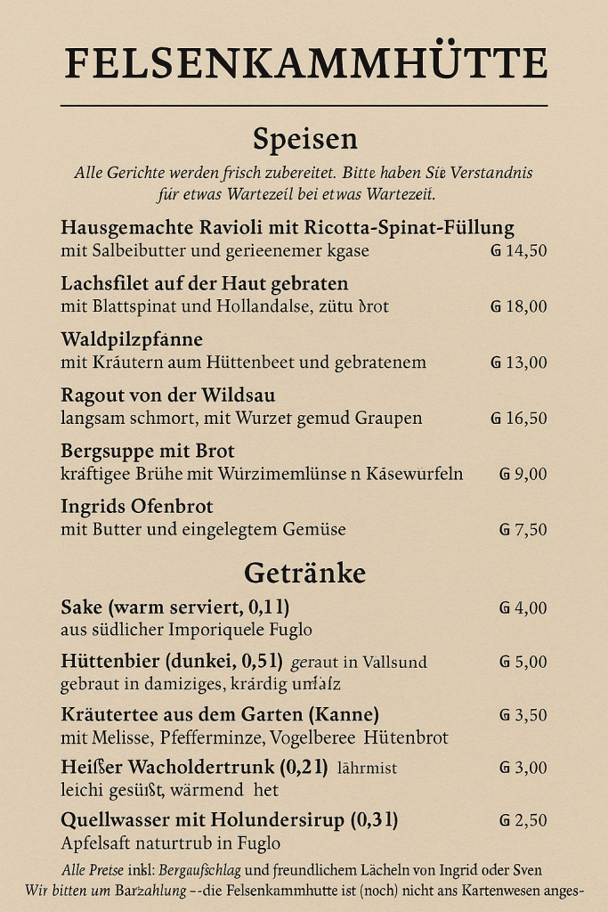 Die Karte der Felsenkammhütte ist überschaubar, dabei bewusst vielfältig gestaltet, um den unterschiedlichen Ansprüchen von Wanderern gerecht zu werden. So gibt es kräftige Suppen mit saisonalen Gemüsen, außerdem Ravioli, die mit Ricotta und Spinat gefüllt sind, serviert mit einer leichten Salbeibutter und etwas geriebenem Hartkäse. Viele Gäste kommen eigens wegen dieser Ravioli, die Ingrid nach einem Rezept ihrer Tante Solveig aus Fuglo herstellt. Ebenfalls beliebt ist das Lachsfilet, das Sven in der Eisenpfanne auf der Haut brät und mit frischem Blattspinat und hausgemachter Hollandaise anrichtet. Zum Abschluss empfehlen die Alversons ihren Gästen gern einen ungewöhnlichen Genuss: warm servierter Sake, importiert über eine Händlerfamilie aus Fuglo, die enge Beziehungen zu einem Händler aus dem fernen Süden pflegt.