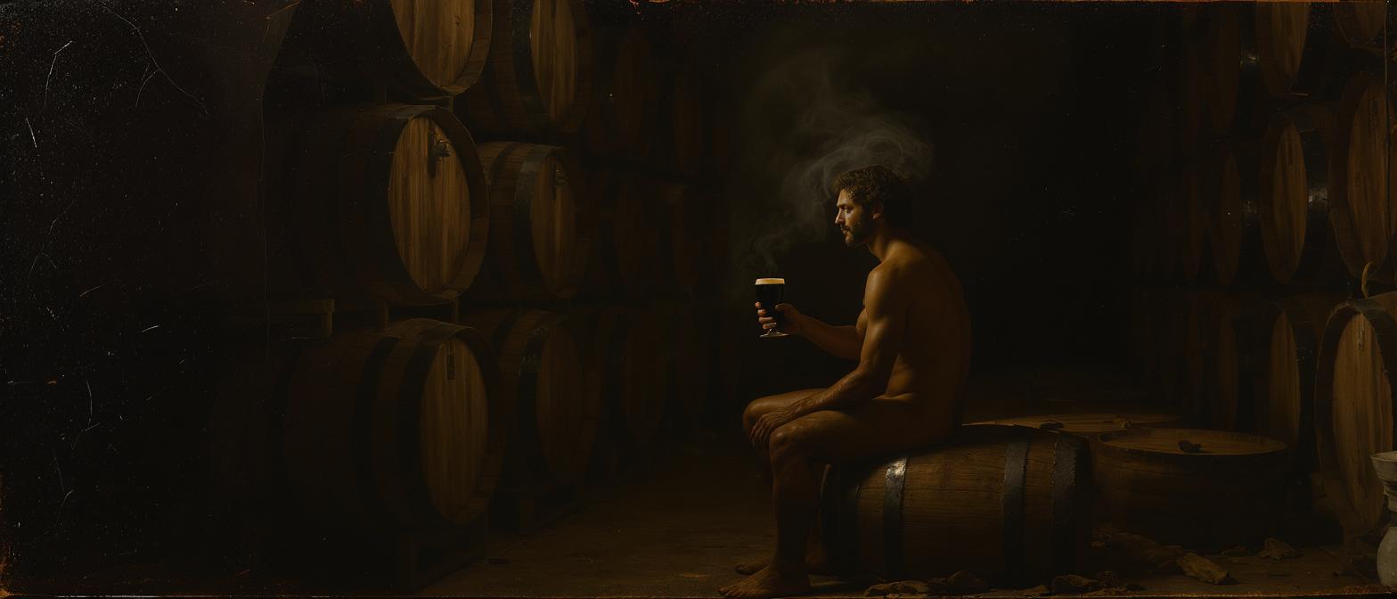 In der Serie der Bilder sticht „Barrel Room Stillness“ durch seine malerische Tiefe hervor. In einem dunklen, fast klösterlich anmutenden Fasskeller sitzt ein nackter Mann auf einem geöffneten Holzfass. Seine Haltung ist ruhig, leicht nach vorne gebeugt, in der Hand ein Becher mit dunklem Bier, dessen Oberfläche fast schwarz wirkt. Der Raum ist gefüllt mit dicht gestapelten Eichenfässern, durch die eine feuchte Kühle zieht. Schwacher Dampf steigt im Hintergrund auf. Die Beleuchtung ist zurückhaltend, beinahe Rembrandt-artig – Schatten modellieren den Körper wie aus einer anderen Zeit. Das Bild wirkt wie ein Stillleben: der Körper als Gefäß, das Bier als Spiegel innerer Sammlung.