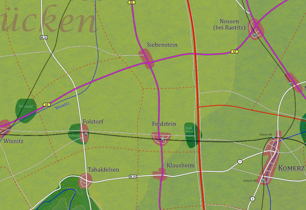Feldstein, mit seinen 745 Einwohnern ein mittelgroßes Dorf im Landkreis Kreuzberg, liegt am östlichen Rand des Drosener Rückens, wo das leicht hügelige Land in die offene Blumenthal-Ebene abfällt. Schon von Weitem erkennt man die aufgelockerten Strukturen des Ortes: rote Dächer, umgeben von Gärten, Feldern und alten Obstbäumen, die in den kleinen Parzellen rund um das Dorf gepflegt werden. Die Lage am Übergang von Höhenzug zu Ebene hat Feldstein immer wieder zu einem Ort der Begegnung und des Austausches gemacht. Wer mit dem Zug anreist, erreicht den kleinen Bahnhof am westlichen Rand des Dorfes, der an der Stammbahn zwischen Bierona und Nova liegt. Der Bahnanschluss macht Feldstein trotz seiner Abgelegenheit für Pendler und Reisende gut erreichbar, während im Dorf selbst das Tempo gemächlicher bleibt.