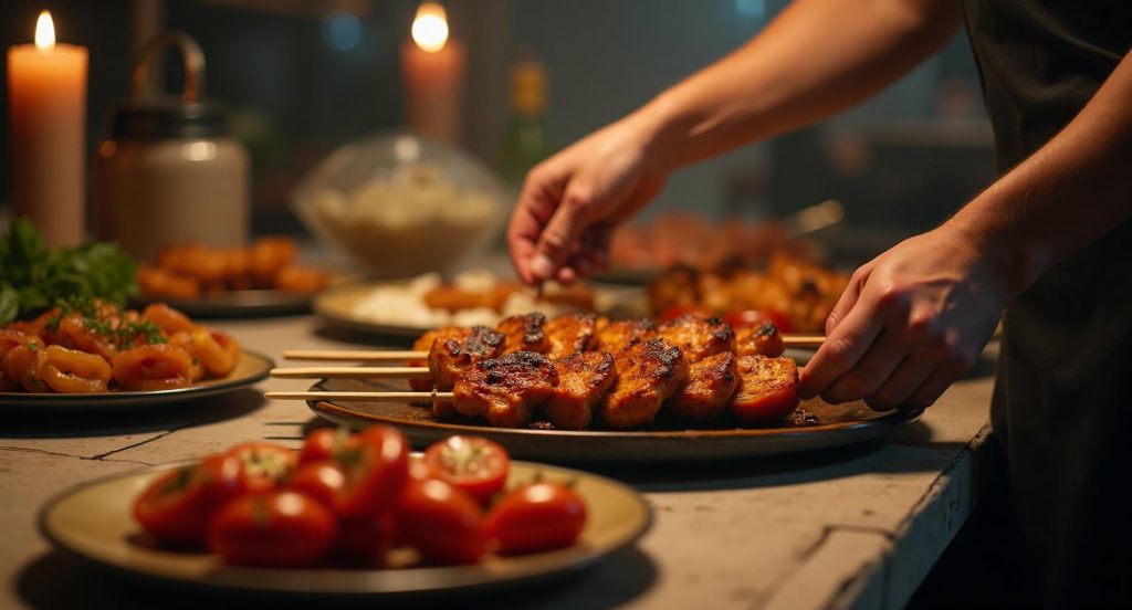 Gleich daneben hantiert Marco Geyer, ein kräftiger Mann in den Vierzigern mit einer Vorliebe für praktische Lösungen. Als gelernter Tischler aus der Nebelitzallee hat er nicht nur die Paprika-Hühnerspieße vorbereitet, sondern auch ein improvisiertes Schneidebrett aus Restholz mitgebracht. Jeder darf seine Spieße selbst stecken, die bunten Paprikawürfel liegen ordentlich sortiert in einer Schale, daneben marinierte Hühnerstücke, die nach Knoblauch und Zitronensaft duften. „So bleibt jeder kreativ“, meint Marco, während er schon die ersten Spieße über die Glut legt.