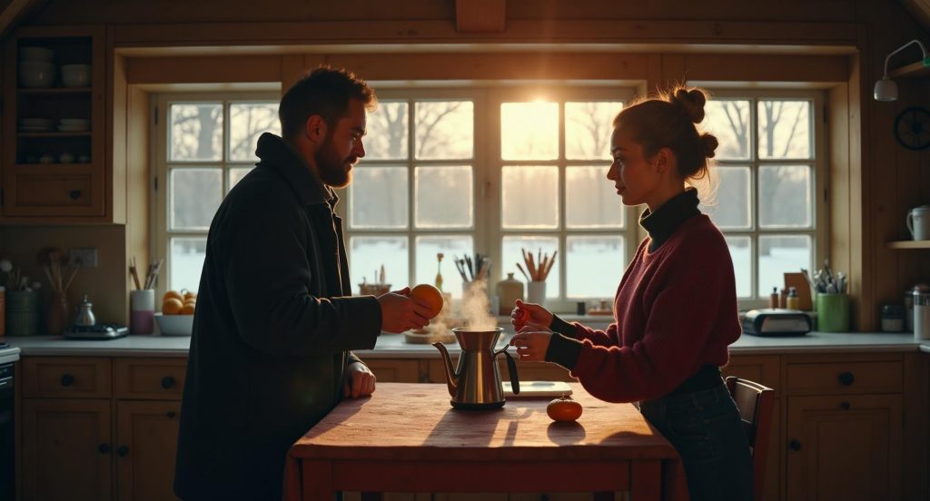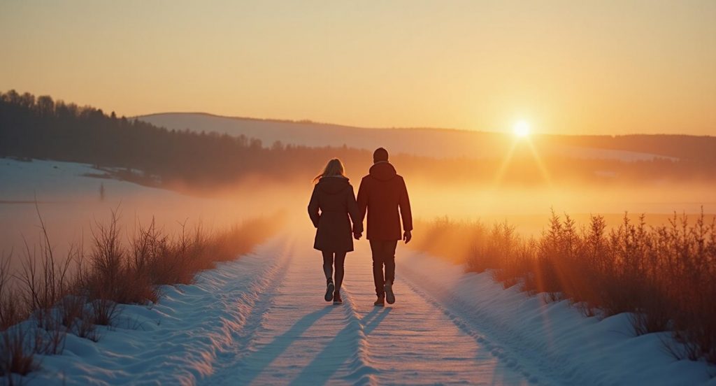 Rasmus entschied, einen Spaziergang zu machen. Er zog den dicken Mantel an, nahm Elin bei der Hand, und sie gingen gemeinsam den Feldweg Richtung Wäldchen. Der Schnee knirschte unter ihren Schuhen, und die Luft war klar. In der Ferne glühte der Himmel noch schwach vom Sonnenuntergang, über den Feldern stieg Nebel auf. Sie sprachen nicht viel, aber das Schweigen war kein Schweigen der Leere, sondern ein ruhiges Nebeneinander.