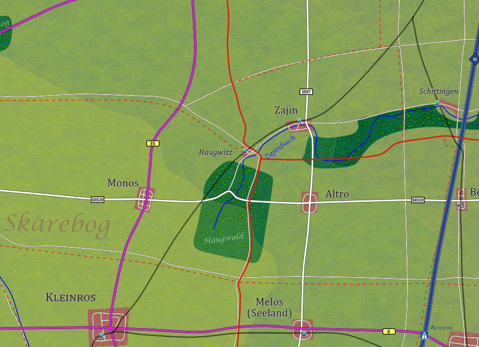 Haugwitz ist ein sehr kleiner, aber charaktervoller Weiler auf dem Skarebog im Landkreis Nassfeld, gelegen auf 203 Metern Höhe. Mit nur 38 Einwohnern gehört er zur Gemeinde Monos und liegt im Tal des Zajinbaches, der von Westen her durch den Ort fließt und sich nach Osten in die Niederungen ergießt. Eingebettet am Rande des dichten Haugwaldes, wirkt Haugwitz abgeschieden, gleichzeitig jedoch durch seinen Bahnanschluss an der Linie 87 der Seelandbahn überraschend gut angebunden. Diese Strecke verbindet Grenzburg in Buthanien mit Seestadt und macht das Dorf zu einem kleinen Knotenpunkt zwischen internationalem Transit und lokalem Alltag.