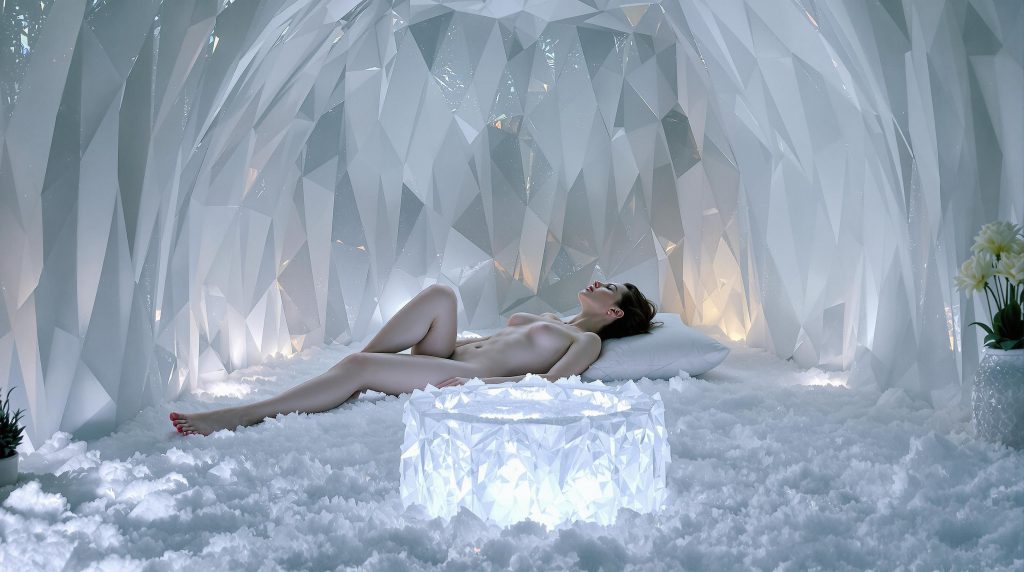 Sie führte ihn in ihre Gemächer, in eine Kammer, deren Wände aus kristallinem Eis bestanden, das sich in tausend Facetten spiegelte. Ein Lager aus weißen Fellen lag in der Mitte, so rein, dass er kaum wagte, es zu berühren.