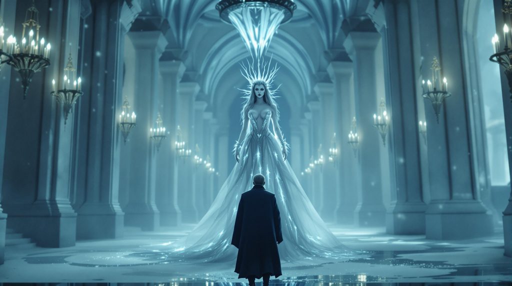 Als er die Schwelle überschritt, schlossen sich die Tore hinter ihm lautlos. Das Innere des Schlosses war ein Reich aus Frost: Wände, die wie Diamanten glitzerten, Treppen aus gefrorenem Nebel, und Hallen, in denen Eisspiegel sein Bild tausendfach zurückwarfen.